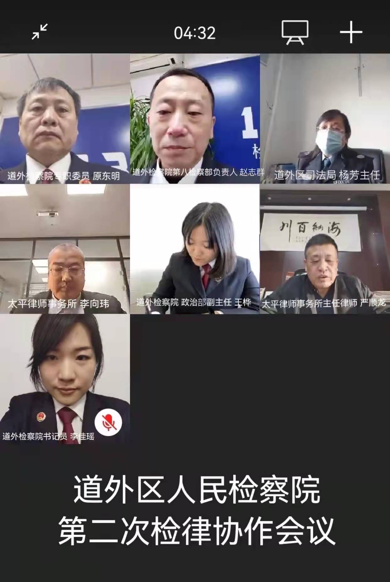 為深入貫徹習近平法治思想,進一步加強律師執業權利保障,推動檢律良性協作,2021年12月28日上午,哈爾濱市道外區人民檢察院召開2021年第二次檢律協作會商會議,以視頻會議形式與道外區司法局、黑龍江太平律師事務所連線,共商共議檢律協作工作。會議由該院第八檢察部負責人趙志群主持,該院檢察委員會專職委員原東明、道外區司法局楊芳主任及律師代表參加會議。