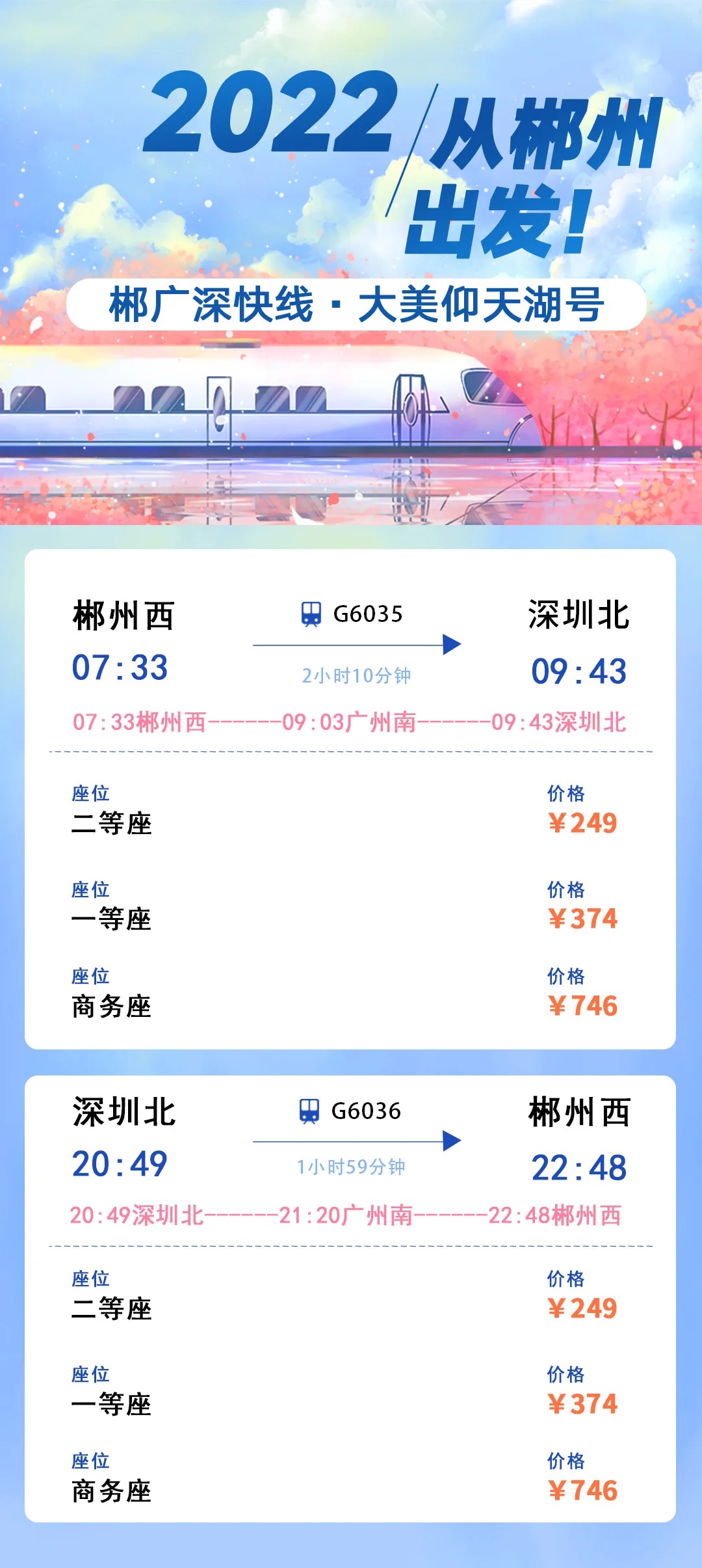 2022年1月1日早上7點33分,首趟「郴廣深快線·大美仰天湖」高鐵動車組列車在郴州首發。列車於當日9:03到達廣州南站,9:43到達深圳北站,當日20:49從深圳北站返回,21:20到達廣州南站,22:48到達郴州西站。