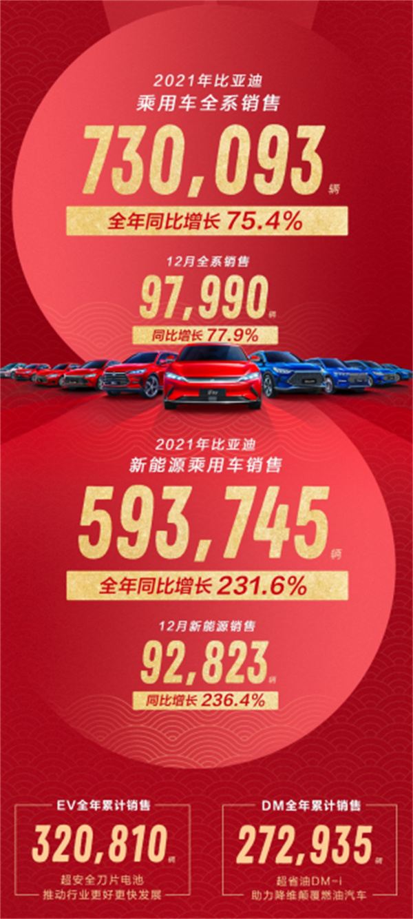 伴隨着12月數據的出爐,比亞迪乘用車2021年全年銷量數字也水落石出,達到730093輛,同比增長75.4%;新能源乘用車全年銷量593745輛,同比增長231.6%。這也是截至目前的中國新紀錄,是此前中國紀錄的2.4倍。