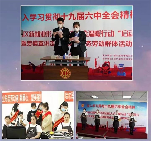 啟動儀式上,黑龍江省金盾保安守護押運有限責任公司點鈔員、哈爾濱孫進高級技工學校美容美髮師、哈爾濱優儂佳家政服務有限責任公司哈爾濱分公司月嫂等進行了點鈔、美容美髮、月子餐水果拼盤製作等專業技能展示,贏得了陣陣掌聲。市、區總工會領導為新入會的新就業形態勞動者代表佩戴了會徽,頒發會員證以及入會大禮包,此次活動送去了針織帽等防寒物資400餘件,價值1.6萬餘元。為新業態勞動者們送去了冬日的溫暖,讓他們感受到了工會大家庭的關懷。