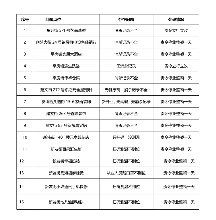 為嚴格落實「外防輸入、內防擴散」總體要求,哈爾濱市平房區市場監管局組織相關成員單位組成專班,對平房區市場主體開展不間斷檢查,1月3日,檢查發現 15家市場主體存在落實防疫措施不到位問題,均被責令關停。