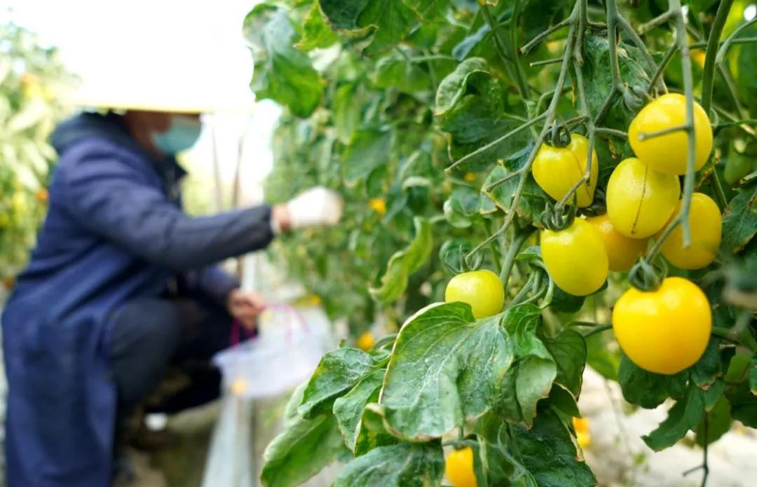 在濱湖村一心蔬菜示範種植基地,我們走進種植大棚,形態均勻、色澤鮮亮、個頭飽滿的水果番茄掛滿了枝頭。負責人張瀚文正在自家的大棚採摘剛剛成熟的小番茄,黃色的、綠色的、紅色的,五顏六色的小番茄格外顯眼。