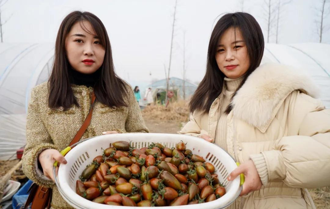 1月7日上午,我們首先走進小聯圩村果蔬特色產業園內的智成採摘園大棚,鮮綠的藤蔓上掛着一個個小番茄,沁出水果的清香,紅的、黃的、紫的、綠的……遊客和農戶穿梭在藤蔓之間,熟練地採摘着,一派繁忙景象。園區負責人張克成告訴我們,由於水果番茄在冬天比較暢銷,所以今年品種也增加到了8個,有金鑲玉、夏日陽光等品質上佳的品種。