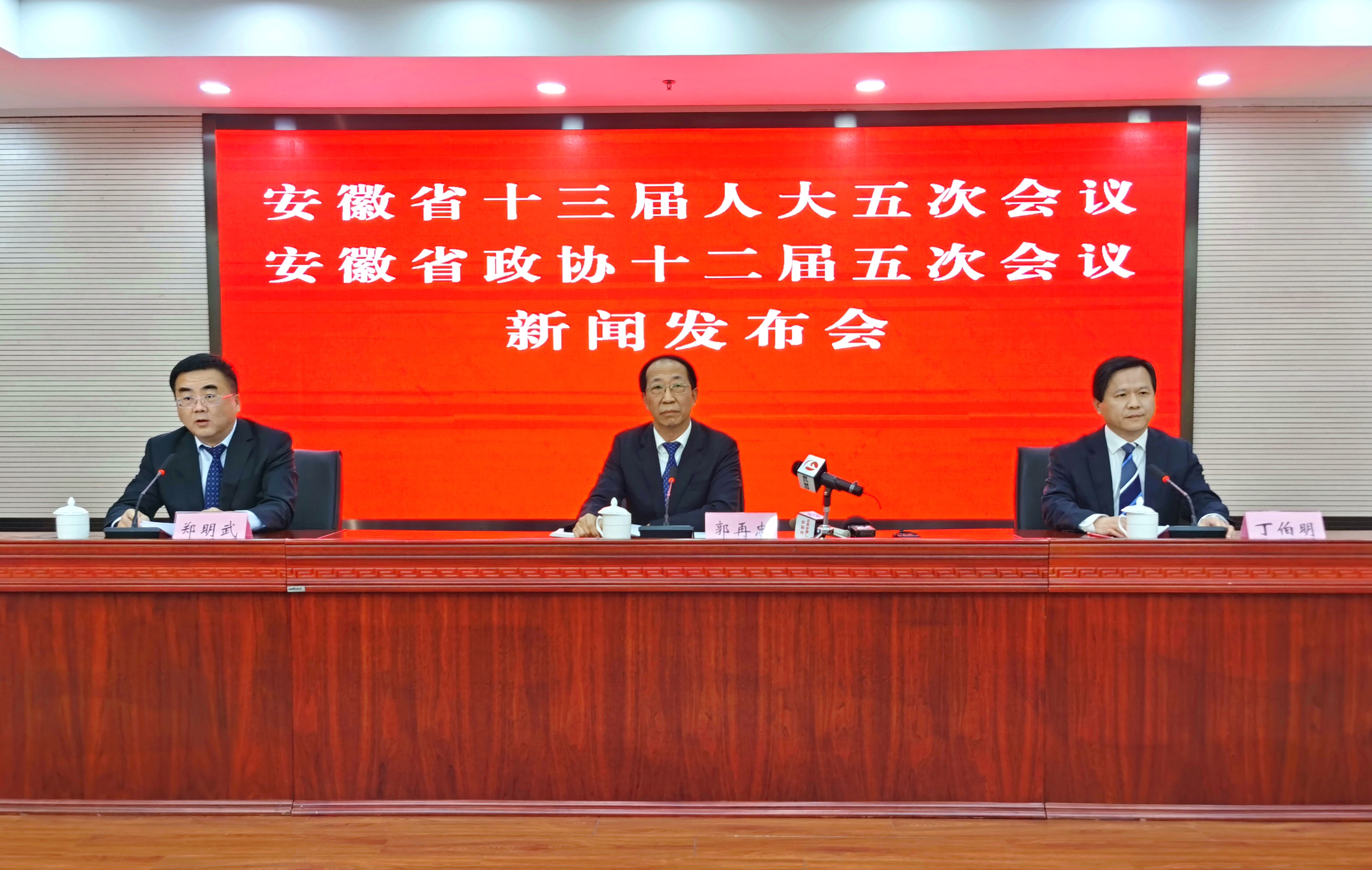 安徽省十三屆人大五次會議、安徽省政協十二屆五次會議新聞發佈會現場,左起:安徽省委宣傳部副部長、省政府新聞辦主任鄭明武主持發佈會,省人大常委會副秘書長郭再忠,省政協辦公廳副主任丁伯明先後介紹相關情況(孫軍/攝)