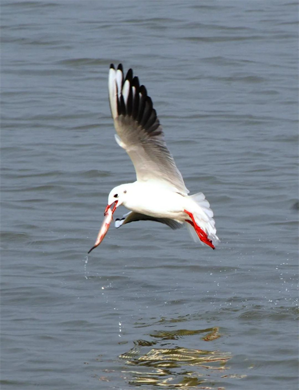 紅嘴鷗,俗稱「水鴿子」,體形和毛色都與鴿子相似,嘴和腳皆呈紅色,身體大部分的羽毛是白色,尾羽黑色。其數量大,喜集群,在許多沿海港口、湖泊都可看到。一般生活在江河、湖泊、水庫、海灣。主食魚、蝦、昆蟲及水生植物。(何勝忠 龔舒斌)