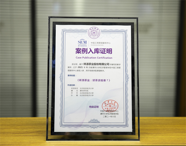 據悉,自2015年始,北航經濟管理學院與祥源茶共同開發了《祥源茶業:好茶賣給誰?》等四篇工商管理類案例,均入選“中國工商管理案例庫”(清華大學經管學院主辦),其中,《Small Farmers in a Big Country: Challenges Faced by Sunriver Tea》被清華大學經管學院案例中心翻譯並向哈佛案例庫投稿。祥源茶業的實踐引起了全球名校和中國知名學府的高度關注,也體現了中國企業向全球分享中國茶企管理經驗與產品理念、中國茶品牌的新探索。