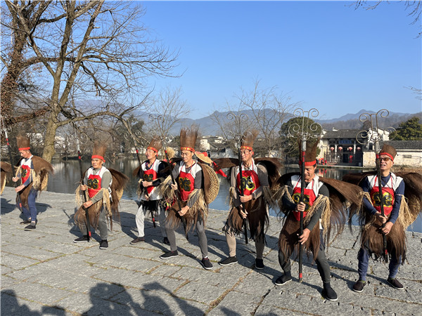 民俗表演藝人在黟縣宏村表演非遺民俗《儺舞》