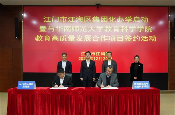 12月20日,廣東江門江海區實驗教育集團、江海區景賢小學教育集團、江海區體藝教育集團、江海區幼教集團等4大教育集團正式成立並舉行揭牌儀式;江海區教育局與華南師範大學教育科學學院簽訂戰略合作協議,共同創建「基礎教育高質量發展示範區」(以下簡稱「示範區」)。