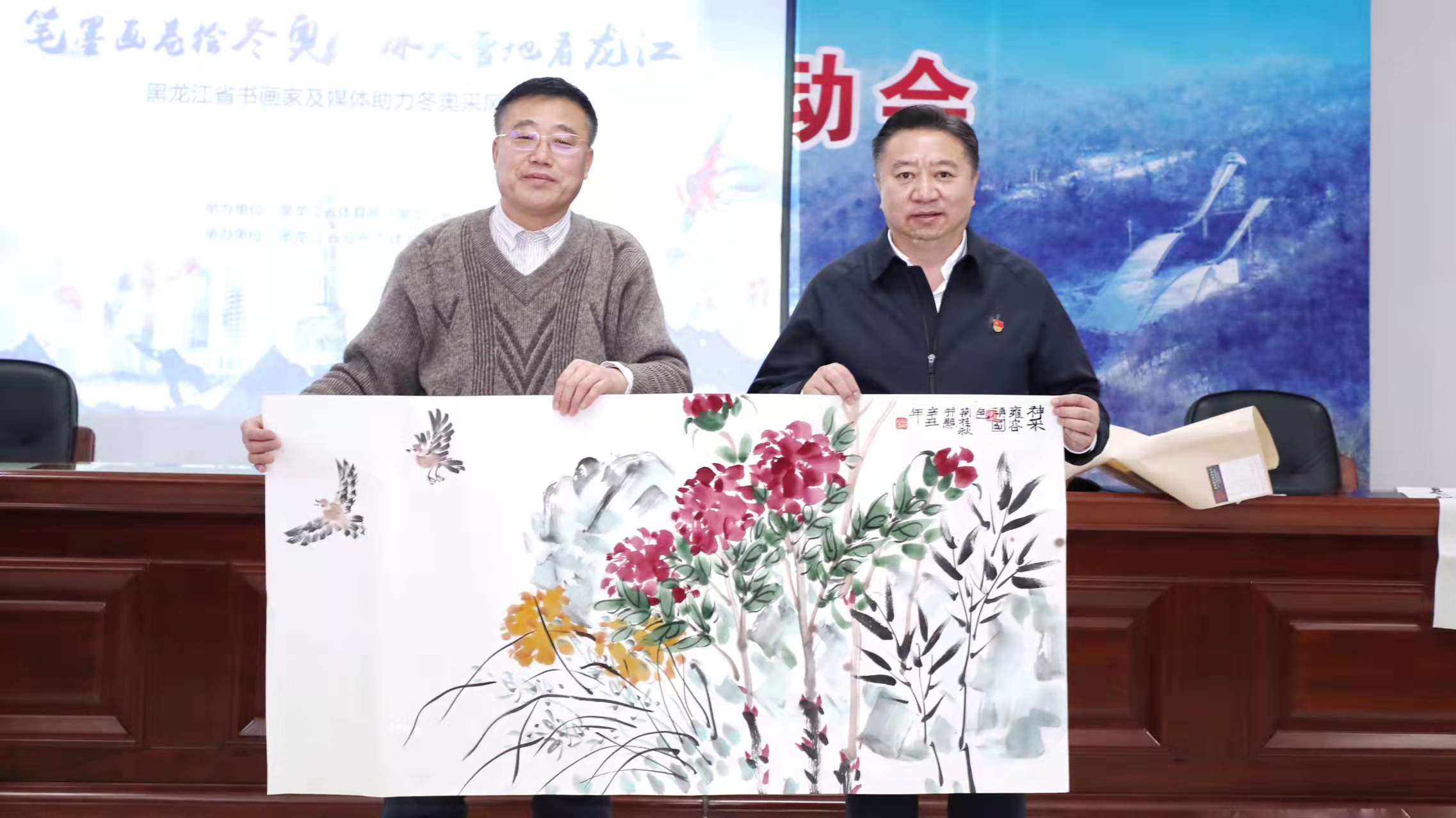 在筆會現場,11位書畫家揮毫潑墨、筆走龍蛇,一個半小時的時間便創作出30餘幅丹青墨寶贈予省體育局和亞布力體育訓練基地。這些作品以助力北京奧運、勉勵龍江冰雪健兒、弘揚體育精神和冰雪文化,以及讚美亞布力的冬景與雪韻為主題。