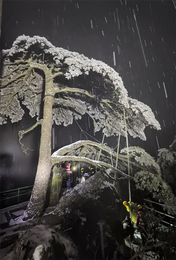 黃山風景區管委會園林局按照“一樹一策、一樹一批人”要求,組建150多人的古樹名木保護應急小分隊,對迎客松、黑虎松實行全天值守,加大重點古樹名木加大巡護監測頻率,適時開展應急保護作業。截至29日晚8時30分,各應急小分隊共計安裝臨時應急支撐杆85根,應急拉纖4根。