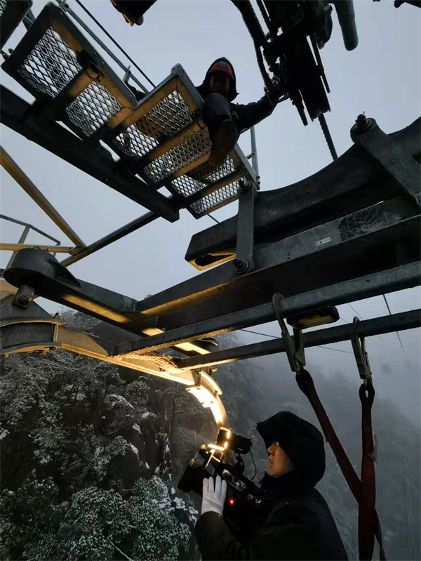景區索道部門在結束昨天的運營後,為防止鋼絲繩結冰,技術部人員在夜間對索道進行低速通宵運行以確保次日索道安全運行和遊客安全。