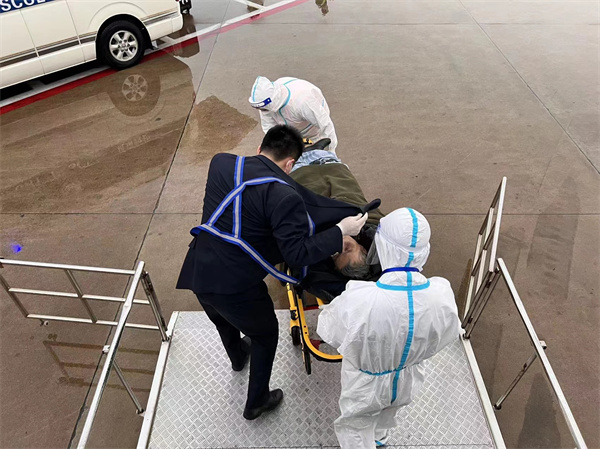 航班返航後立即安排擔架將老人抬至救護車送往就近醫院搶救