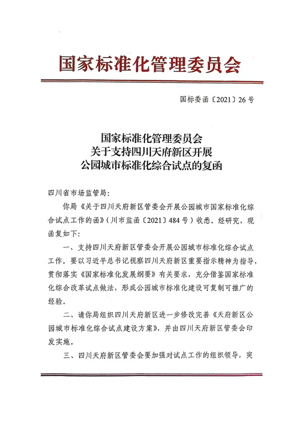 2022年1月28日,國務院正式批覆同意成都建設踐行新發展理念的公園城市示範區,積極創造可複製可推廣的典型經驗和制度成果。此前的2021年12月14日,國家標準化管理委員會印發《關於支持四川天府新區開展公園城市標準化綜合試點的復函》(以下稱《復函》),正式批准四川天府新區開展公園城市標準化綜合試點(期限2022—2025年)。