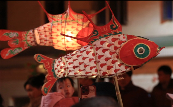 魚燈所到之處,家家戶戶門口都會自發燃放煙火,預祝新的一年四季平安、年年有餘。村民和遊客也把魚燈團團包圍,或拍照留念、或撫摸魚燈,在煙花的映襯之下,每一個賞燈人都興奮不已。(記者 吴敏 通讯员 淩利兵 鄭宏)