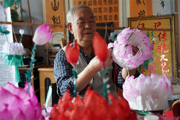 溫師傅一邊粘蓮花燈的花瓣,一邊介紹着蓮花燈的工序。手工彩扎燈籠製作工序繁多,做一個蓮花燈有七道工序,要粘五層花瓣,大燈蓮花燈要粘72個花瓣,小一點的蓮花燈要粘56個花瓣,像複雜一點的猴擀麵燈、六牙西瓜彩燈有13道工序。從選擇扎彩燈的竹子、綁架子、染紙、糊紙、繪畫、貼字到成型完工,再到出售,全是他一個人的活計。由於是祖傳手工藝,他將這門手工藝堅守了半個世紀。