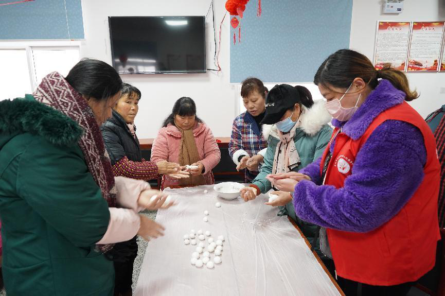 上午9時許,在太平村禮堂內熱鬧非凡,一個個火紅的小燈籠點綴着會場,現場洋溢着歡樂喜慶的氣氛。志願者和村民們忙着揉麵糰、和湯圓、煮湯圓,熱氣騰騰的湯圓從鍋中撈起,送到村民手裡。吃上自己親手製作的湯圓,大家臉上都洋溢着甜蜜的笑容。