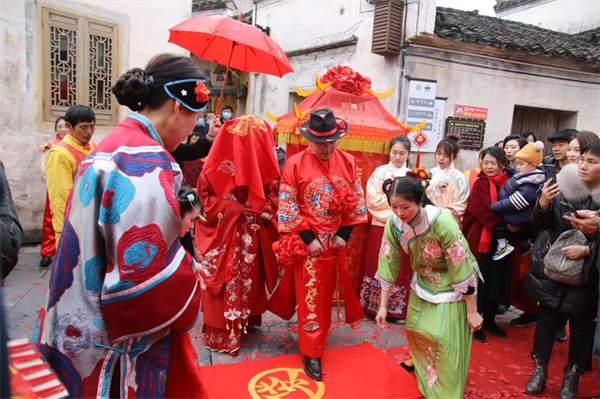 2月16日,正月十六,一對西遞村新人在西遞舉辦了一場傳統的徽州婚禮。通過拋繡球選佳婿的形式,再現徽州文化儀式場景,追憶徽文化發展脈絡,領略徽州千年傳承的傳統婚禮,既是弘揚中國傳統文化,也是在宣導培育傳統節儉的婚禮之風。