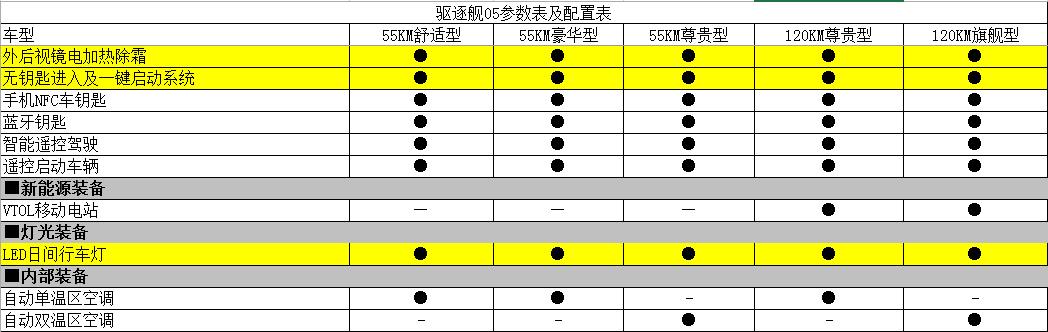 驅逐艦05在屏幕尺寸方面也進行了提升,除車系入門的舒適型外,全系搭載8.8英寸全液晶儀錶盤。除此之外12.8英寸8核自適應旋轉懸浮Pad(高配車型升級為15.6英寸)大屏及操作台小巧的旋鈕式換擋按鈕共同組成的「兩大一小」全新組合,將整體科技值拉滿。同時還做到了「入門即高配」,LED日間行車燈、無鑰匙進入及一鍵啟動系統、自動空調(高配車型雙溫區空調)、後排出風口、定速巡航、外後視鏡電動調節+加熱等超17項高價值功能全系標配,顯示了驅逐艦05優秀的產品實力。101KM車型還增加了VTOL移動電站等亮眼功能,解鎖更多用車場景,實力領先同級。