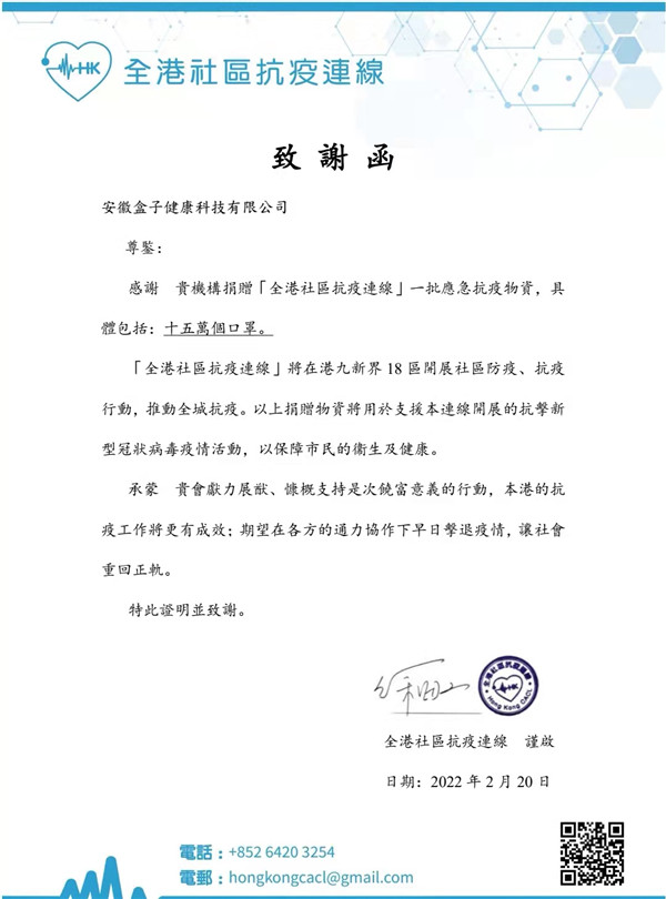 香港疫情爆發以來牽動著全國人民的心。近日,安徽合肥市瑤海區企業安徽盒子健康科技有限公司率先回應黨中央的號召,緊急調動生產資源,為香港地區捐助總價值500萬元、全球獨家的新冠病毒滅活口罩。該批物資從合肥出發於24小時內運抵香港交付,幫助香港人民抗擊疫情。