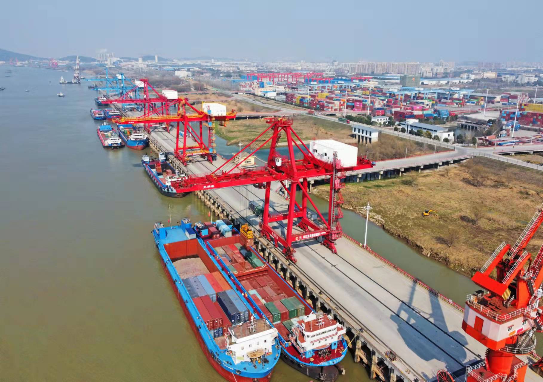 2月24日,蕪湖港集裝箱碼頭一派繁忙景象,集裝箱貨輪正在有序停靠碼頭進行裝卸作業(楊大偉/攝)