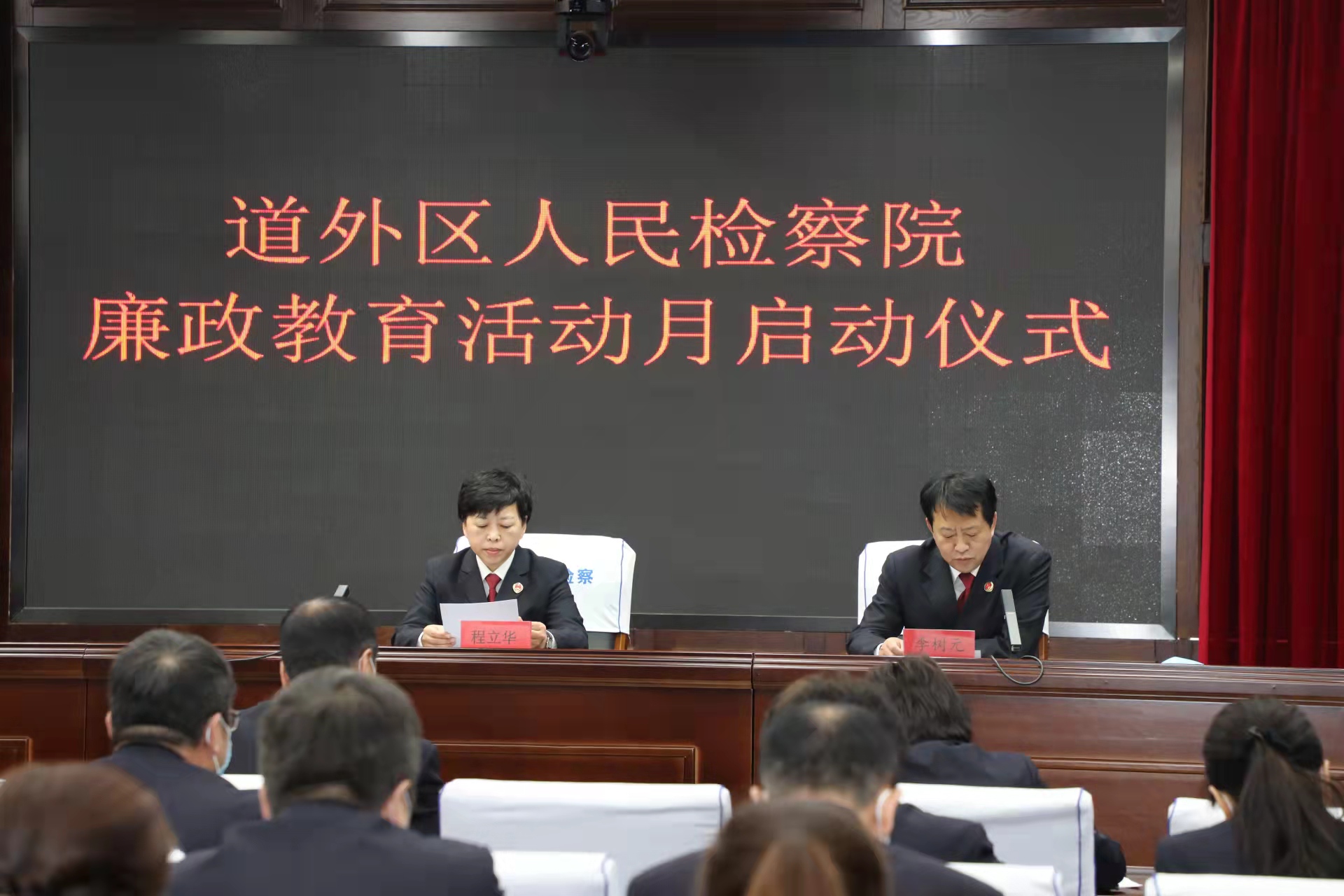 新起點、新征程,為進一步推進黨風廉政建設工作,提升檢察幹警廉潔意識,樹立新風尚、爭創新業績、展現新風貌,2月16日下午,哈爾濱市道外區人民檢察院召開廉政教育活動月啟動儀式,該院黨組書記、檢察長程立華以「上講台」講廉政課的方式,以直擊人心的力量與銳意進取的精神,教育引導全院幹警樹立信心、振作精神,激勵鼓舞全院幹警收心干工作、聚力謀發展。會議由該院黨組副書記、副檢察長李樹元主持,班子成員及全院幹警參加會議。