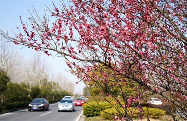 春風送暖紅梅開,朵朵花兒放光彩。在濱湖大道和北外環,無論坐在公交車裡還是自駕,都能看到道路中間綠化帶儘是粉色的梅花,似是在歡迎遠方歸巢的遊子,也似在歡迎專程來巢湖遊玩的客人。