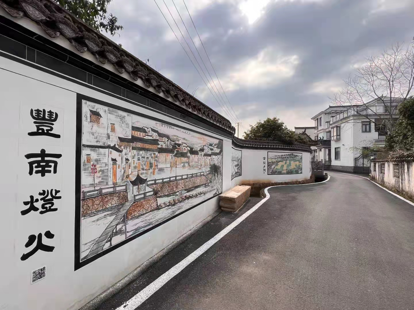 走進村口,一幅大型牆繪《豐溪攬勝圖》展現在眼前,這是莘墟牆繪中最大的一幅作品,長18米,高2米5,描繪了從豐樂河水庫一直延伸到高鐵大橋10公里範圍內,兩岸人民豐衣足食、歡樂祥和的景象。2021年,本土書畫家汪慶譽和當地政府多方策劃組織,先後邀請百餘名書畫家走進莘墟,在村民庭院外牆上創作有關莘墟村古代人文物景、新時代村容村貌、田園風光等畫作,“莘橋日出 、金竺夕陽、琴溪和鳴、豐南燈火”古時莘墟四景生動再現,260多幅作品,為莘墟美麗鄉村建設增添了色彩,文化藝術點亮了整個歷史悠久的古村落,這是徽州區西溪南鎮莘墟自然村的借勢省級“美麗鄉村”示範村打造的特色IP。