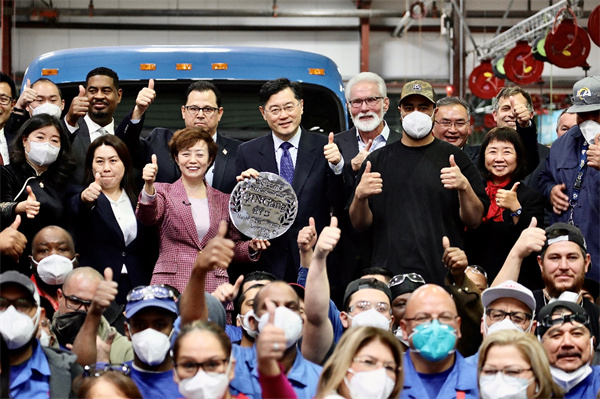 秦刚大使表示:“在兰卡斯特工厂的参观非常愉快。这里生产的大巴和卡车被投放到了很多美国城市,你甚至可以在迪士尼乐园附近也能看到比亚迪大巴。我们都有梦想,在比亚迪兰卡斯特工厂,你能看到中国与美国员工互帮互助,大家不仅是在共同生产大巴,更是在携手筑梦——这个梦想关乎更多的就业机会、更好的未来、更绿色的世界。”