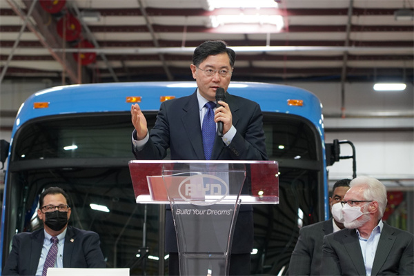 洛杉矶时间2022年3月1日,中国驻美大使秦刚到访比亚迪位于加州兰卡斯特市的纯电动大巴工厂。中国驻洛杉矶总领事张平、兰卡斯特市长Rex Parris,以及比亚迪股份有限公司执行副总裁兼比亚迪美洲分公司总裁李柯参加会见。