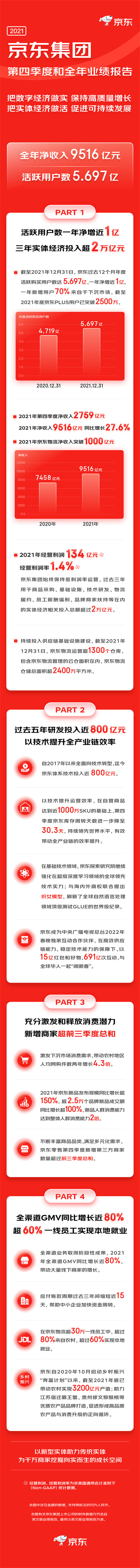 年報顯示,2021年第四季度,京東集團淨收入為2759億元人民幣(約433億美元),同比增長23.0%;2021年全年淨收入達到9516億元人民幣(約1493億美元),同比增長27.6%。京東物流2021年全年淨收入突破1000億元人民幣。