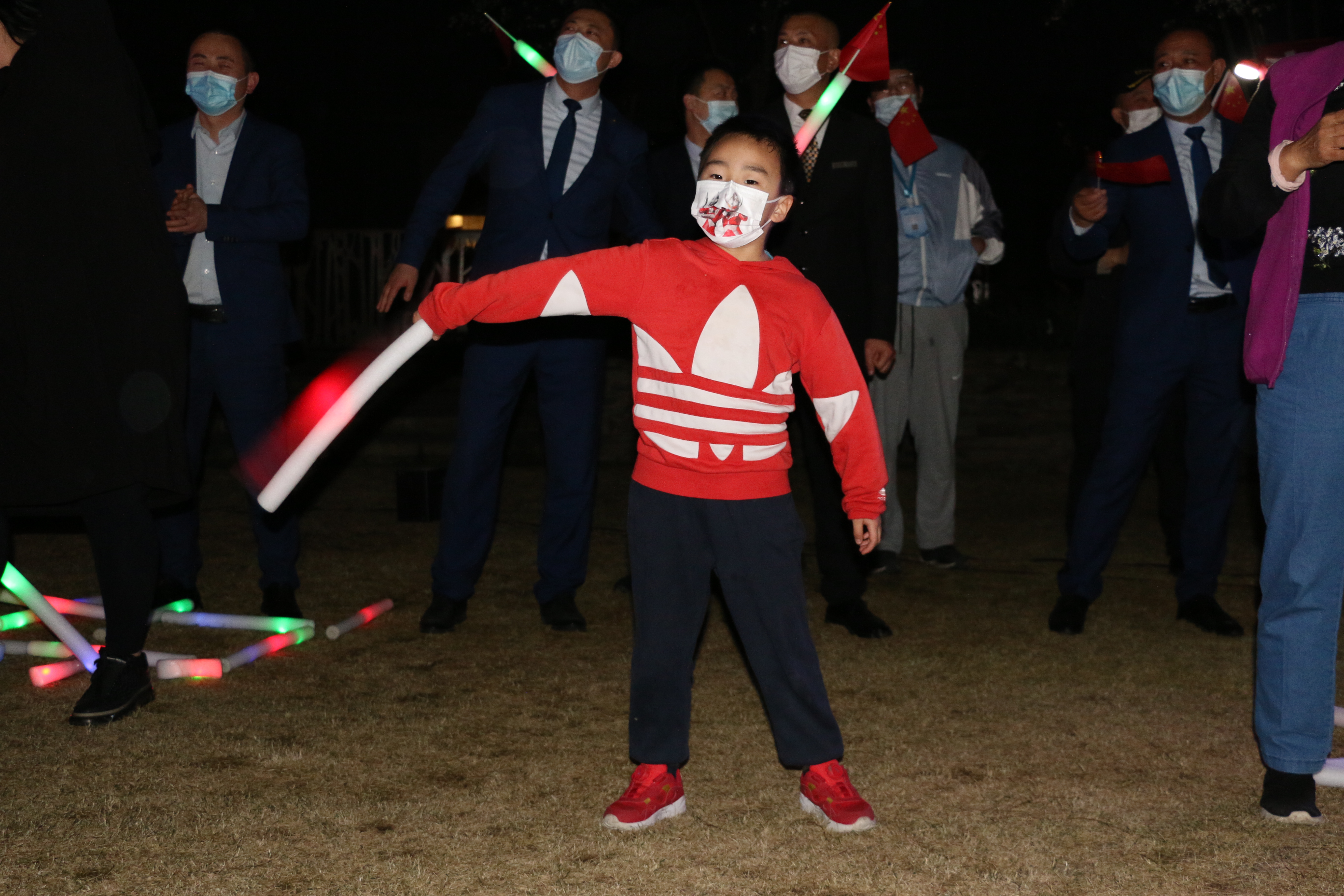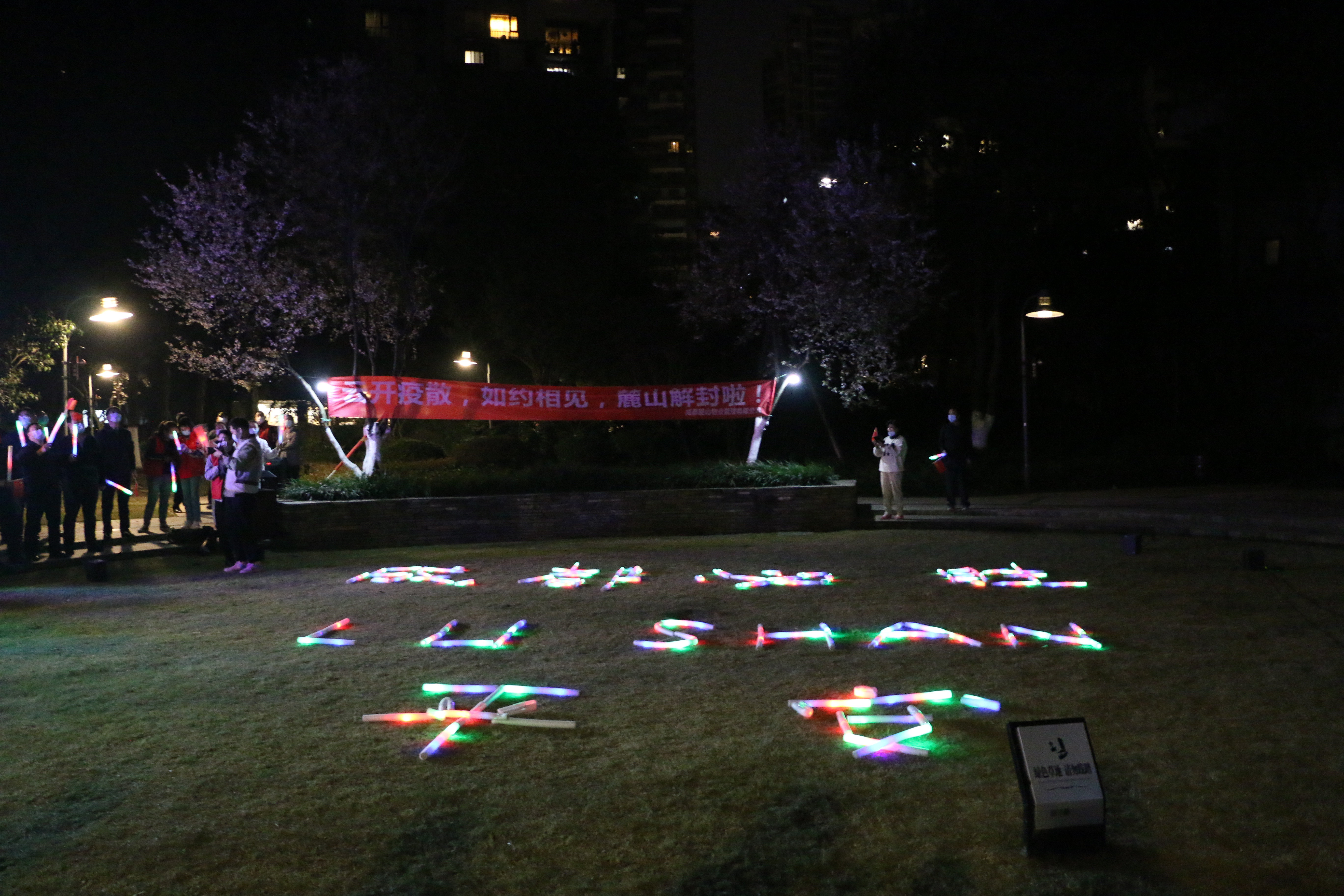「我和我的祖國,一刻也不能分割,無論我走到哪裏,都流出一首讚歌……」「時間的手撫過了臉頰,他們誰都沉默不說話;我希望許過的願望一路生花,護送那時的夢抵擋過風沙……」「你在我生命中,太多的感動,聽我說謝謝你,因為有你,溫暖了四季……」凌晨零時的封控樓棟下,一首又一首的歌聲輕輕迴蕩,陸續走出的居民安靜而喜悅。地面的熒光棒拼成的「平安」二字閃耀亮起,燈光牌上的「我們解封啦」「感謝一麓有你」,雖無言,抵萬語。