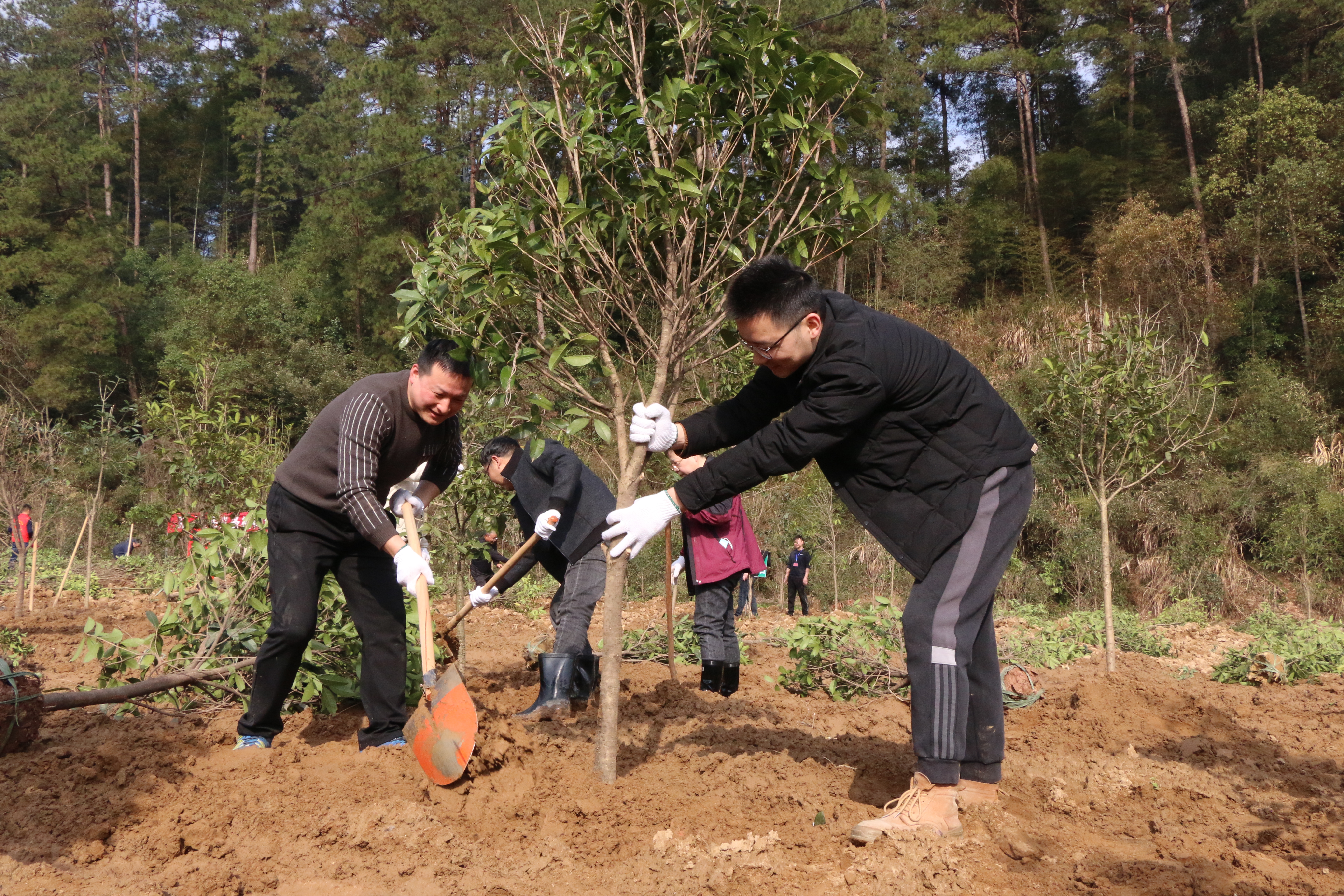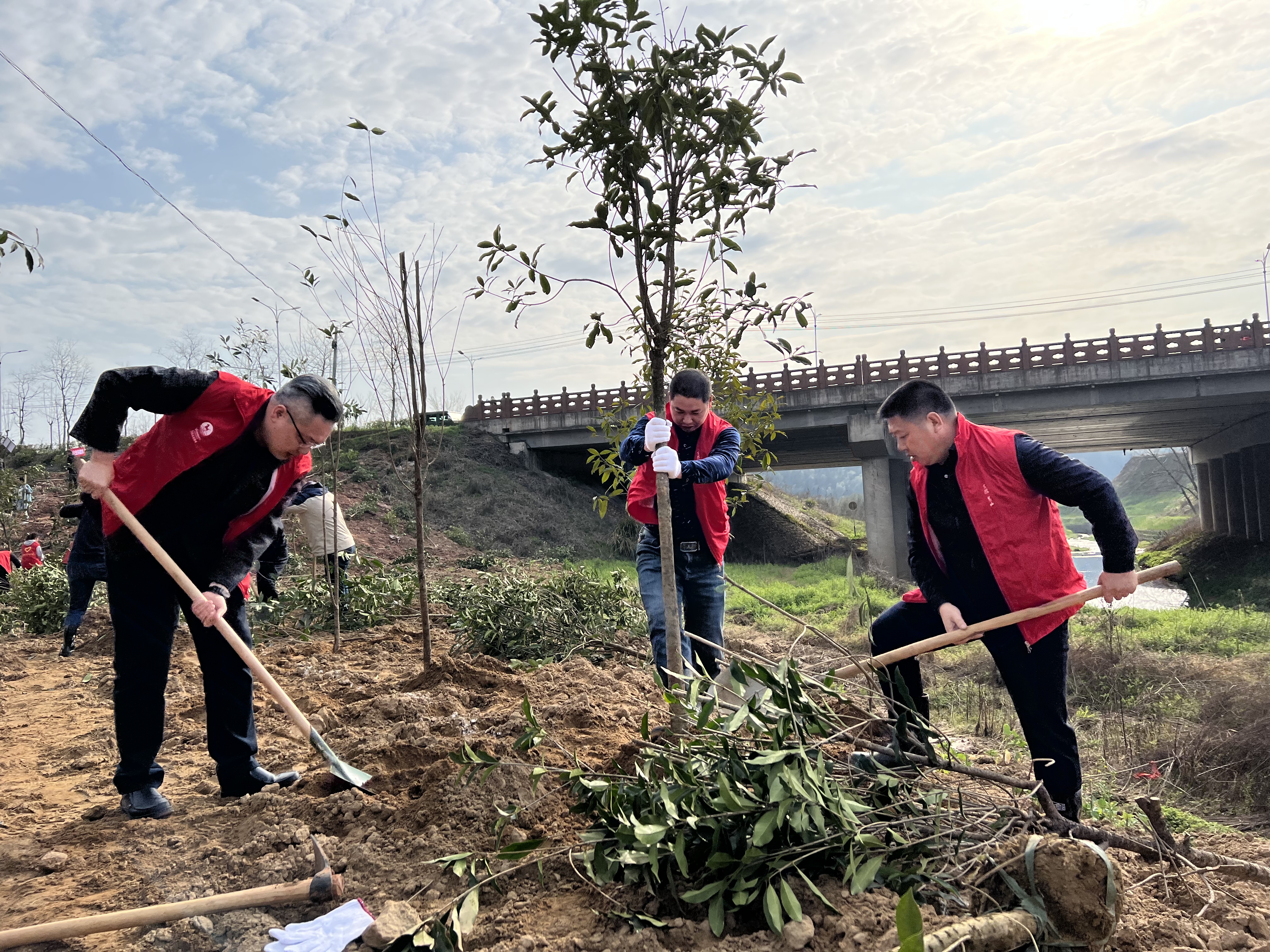 上午9時,植樹現場人頭攢動,大家紛紛來到事先劃定好的區域,兩三人一組、四五人一群,分工協作、配合默契,有的揮鍬鏟土、有的扶正樹苗,有的培土打實,每一道工序都一絲不苟,現場一片熱火朝天的勞動景象。一番忙碌後,2000餘株桂花樹苗迎風挺立,展現出蓬勃生機。