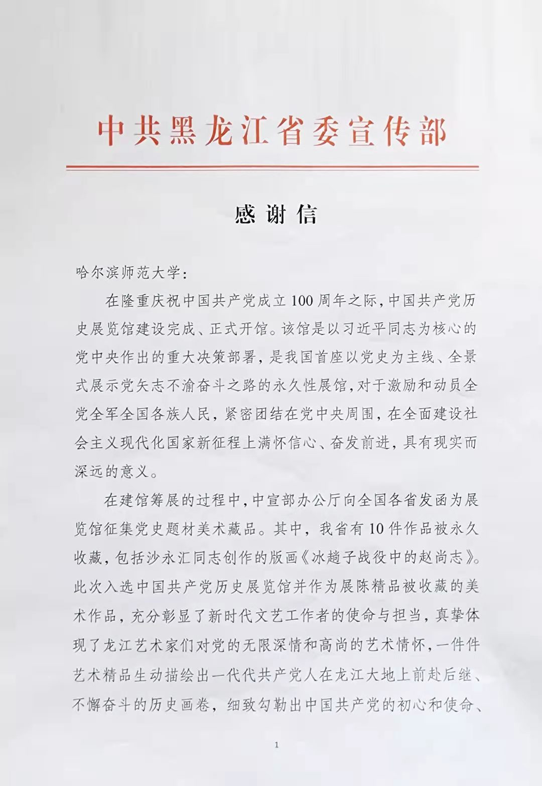 在隆重慶祝中國共產黨成立100周年之際,中國共產黨歷史展覽館建設完成、正式開館。在建館籌展過程中,中宣部辦公廳向全國各省發函為展覽館徵集黨史題材美術藏品。其中,哈爾濱師範大學美術學院教師沙永匯創作的版畫《冰趟子戰役中的趙尚志》入選中國共產黨歷史展覽館並作為展陳精品被收藏,充分彰顯了新時代文藝工作者的使命與擔當,真摯體現了龍江藝術家對黨的無限深情和高尚的藝術情懷。