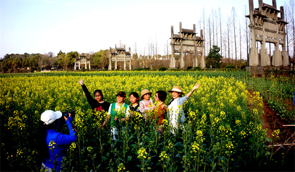滿目金黃香百里,一方春色醉千山。3月13日,安徽歙縣鄭村鎮棠樾村牌坊下,遊客在油菜花地拍攝春天美景。