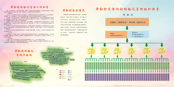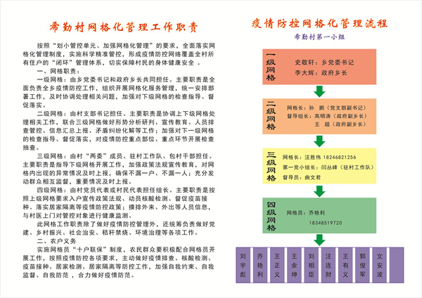 科學設置網格,密織一張「防護網」。據了解他們在原有網格化管理模式的基礎上,建立了鄉、村、黨小組、黨員(或黨員積極分子、村民代表、青年志願者)四級網格化組織體系,明細了網格工作職責、群眾義務和獎懲辦法。特別是在三級網格設置上,堅持把黨小組建立在網格上,至少有3名黨員在網格內;在四級網格設置上實行「十戶聯保」制,每名網格員包保十戶村民,做到了精細有效管理。全鄉統一製作了疫情防控網格化示意圖、網格化管理流程和職責入戶宣傳單、網格長(網格員)工作日誌、工作證,採取疫情防控掛圖作戰,讓百姓清楚了解疫情防控的整個管理流程和自身責任義務,實行網格工作規範化管理。
