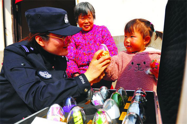 走進村口,見陳奶奶家門口有幾名村民正在剝花生,民警王蓉蓉立刻坐到她們中間,結合典型案例,再對照宣傳畫和仿真毒品模型,給她們講解毒品的種類、毒品的危害、禁毒法律法規,以及防範毒害一、二、三……期間,時而還與村民們交流,回答她們的提問。現場宣傳氣氛十分熱烈,很快吸引了10多名村民圍攏過來旁聽。