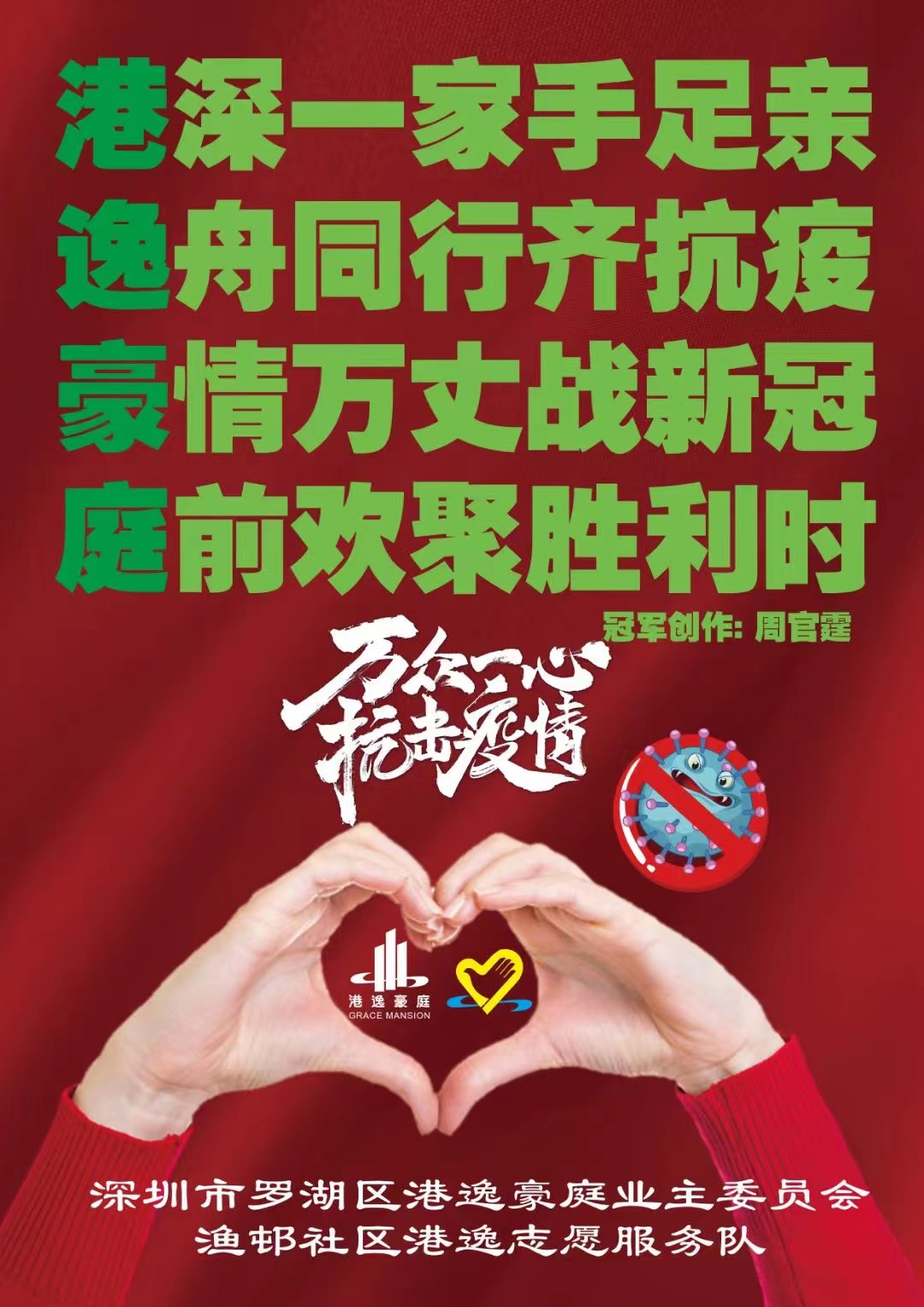 「沒想到吧,英雄出少年!我們漁邨社區港逸抗疫志願服務隊的抗疫標語創作比賽第一名,來自一位12歲的港藉抗疫少年,他還請了一書法家朋友送了服務隊一副字『深港一家親』。感動之餘,我們也送上抗疫包給優異的參賽者們。抗疫工作仍在嚴格進行中,深圳人,萬眾一心,抗擊疫情慢下來是短暫的只為了更好的明天!」深圳市羅湖區漁邨社區港逸志願服務隊隊長、港逸豪庭業主委員會會長王紀明對記者說。