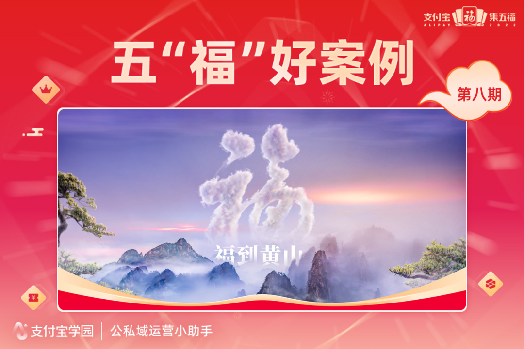 據介紹,黃山景區為了做好自己的私域運營,敏銳地將五福和國潮結合,作為自己在支付寶私域運營的第一步。五福活動期間,黃山小程式訪問人次較同期增長了105倍,發券量突破了15萬張。