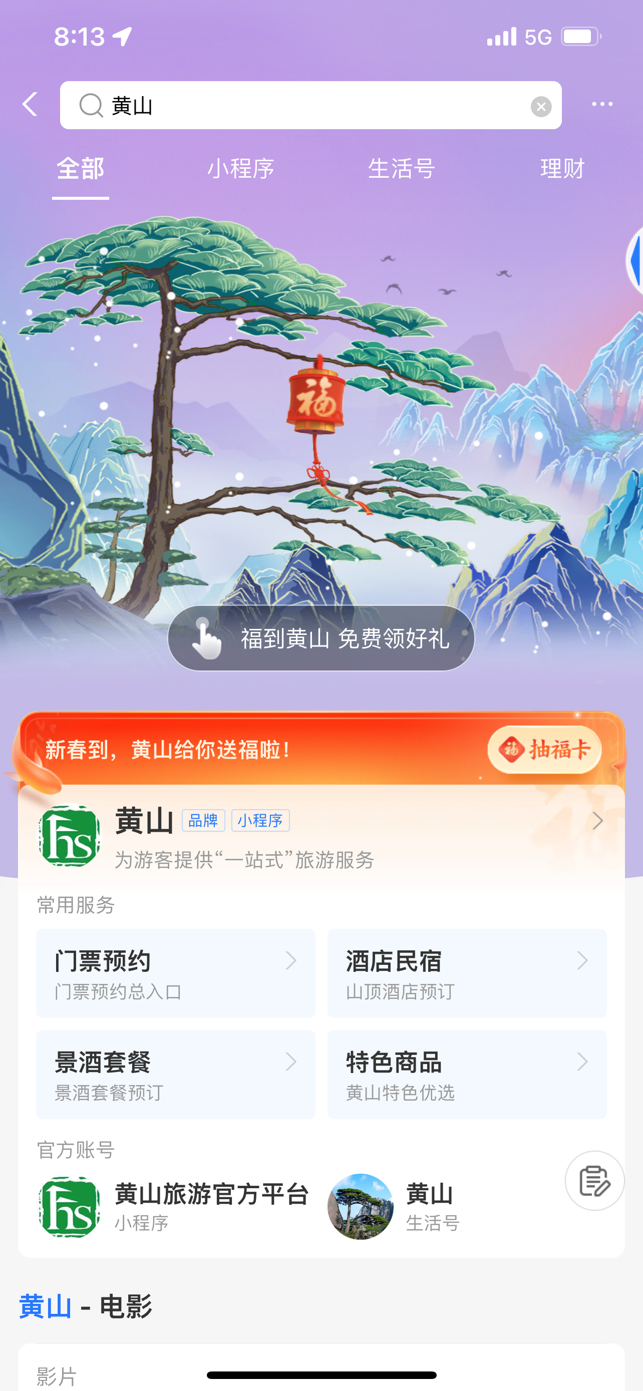 用戶想要領取黃山定制版福卡,可以通過線下掃碼物料或者搜索進入黃山小程式領取福卡,這一操作,成功將新用戶吸引到了黃山自己的支付寶小程式上來。