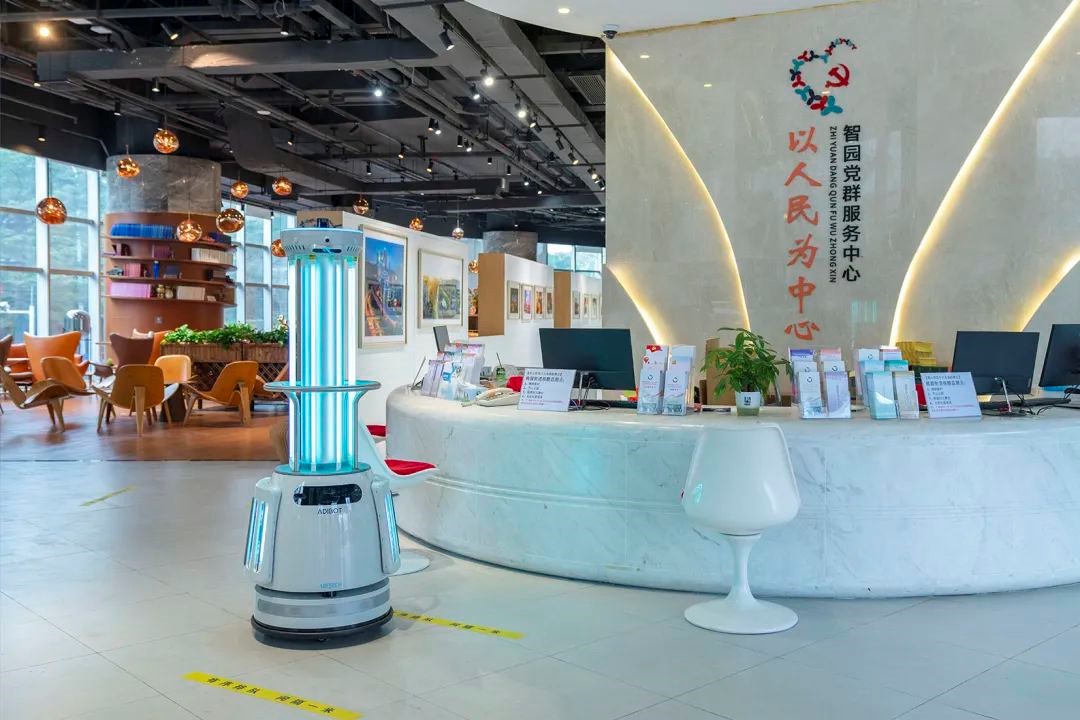 同樣位於園區的優必選科技股份有限公司黨支部則是以硬核科技助力疫情防控,主動派出自主研發的紫外線消毒機械人「志願者」——ADIBOT淨巡士,幫助園區及周邊社區樓宇進行消殺。淨巡士單次運行30分鐘即可完成950平方米的內部環境消殺工作,大大減輕了防疫人員的工作量,凸顯疫情防控中的科技支撐力。