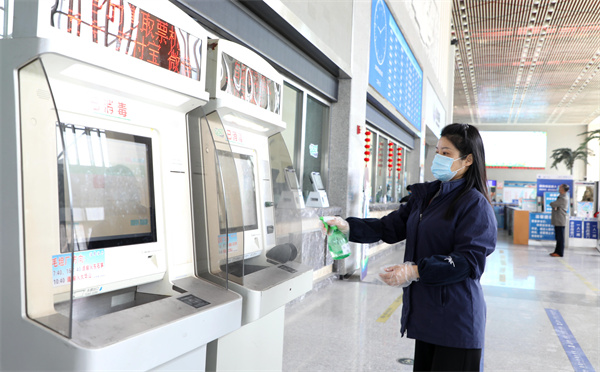 在蜀山區南崗鎮合肥客運西站,工作人員為自助設備消毒(蜀山區委宣傳部供圖)
