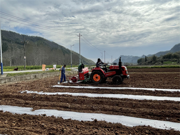 在漁亭鎮團結村下坦組,多臺農用機械在田間來回施肥、起壟、覆膜,器械聲與人們的歡笑聲在春風中交織,翻新的泥土在暖陽中飛揚,呈現出一派忙碌而歡樂的春耕景象。“目前,我們主要任務是將田地平整好,施好肥,為4月的播種做好各項準備工作。”省農科院博士錢益亮介紹道。