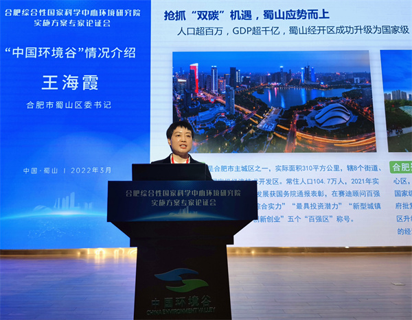 蜀山區委書記王海霞介紹「中國環境谷」相關情況(孫軍/攝)