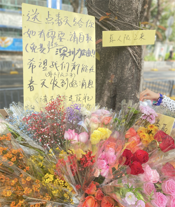 據花店工作人員表示,這些花是前幾天從昆明訂的,現在賣不出去,不如送給大家,希望大家看點鮮花心情會好一點。花店老闆也說,「只是想把這個簡單的愛心傳遞下去,如果居民感受到溫暖的話,我們的初衷就達到了。」深圳,有送春天的人,也有溫暖生活下的「拾花人」。