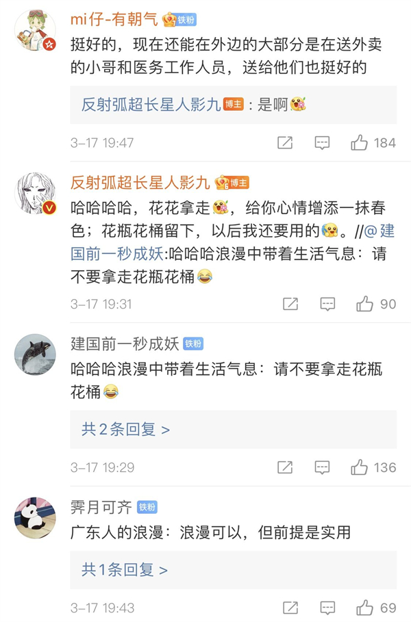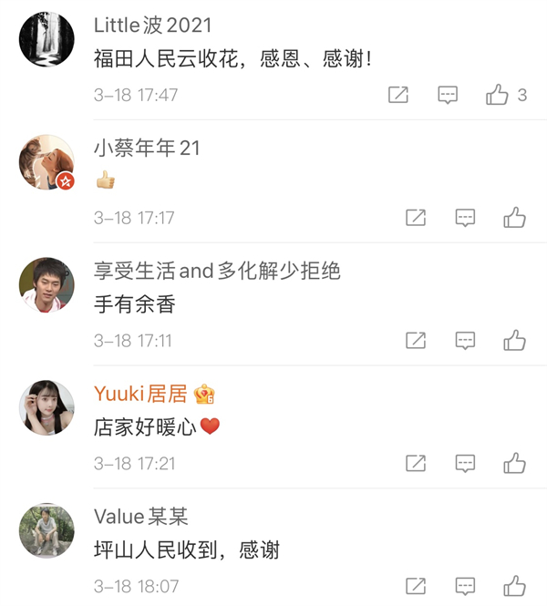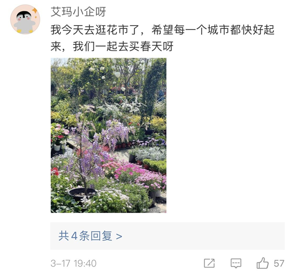 網友紛紛留言評論,「看到後心情立馬回暖」「江南無所有,聊贈一枝春」「花花拿走,給你心情增添一抹春色,花瓶花桶留下,以後還要用,這是浪漫中帶着生活氣息」還有網友分享了她在花市拍下的花,祈願城市快點好起來,我們一起赴春天的約。