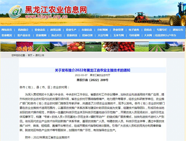 印發了《關於開展2022年農業農村部糧油生產主導品種主推技術和黑龍江省主推技術遴選工作的通知》,組織專家對申報的46個品種和43項技術進行綜合評審,最終向農業農村部推薦13個糧油生產主導品種和14項糧油生產主推技術,並遴選出黑龍江省綠色高效主推技術23項,已於3月4日在農業信息網發佈,為全省農技推廣人員工作指明了方向。同時,各地正按照要求,組裝符合當地實際的技術操作規範,面向科技示範主體和基地進行推廣,加快先進技術進村入戶到田。