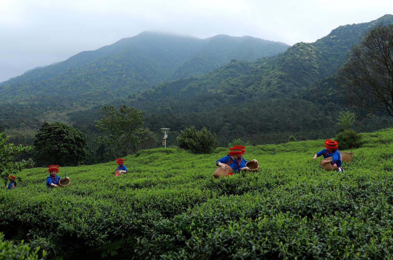 茶香沁人,山歌悠悠。在整齊劃一的茶叢中,茶農三五成群穿梭其間,動作嫻熟地採下今年第一波春茶。藍天、暖陽、茶園、茶樹、茶農勾畫出一幅幅春分採茶忙的詩意畫卷。