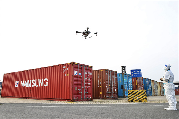 「以往,我們的駐港第三方作業單位還會在港區內開展進口集裝箱的拆裝箱作業,因為防疫,現在這項工作也叫停了。而且要求在使用外貿空箱裝貨前必須進行預防性消毒。」潘曉虎介紹,港區設置了外貿進口集裝箱預消殺專用堆場,箱子直卸後,專業消毒單位會通過電動噴霧器和無人機等裝備展開消殺作業,並對消毒時間、集裝箱箱號、消毒劑名稱和濃度等內容建立台賬。