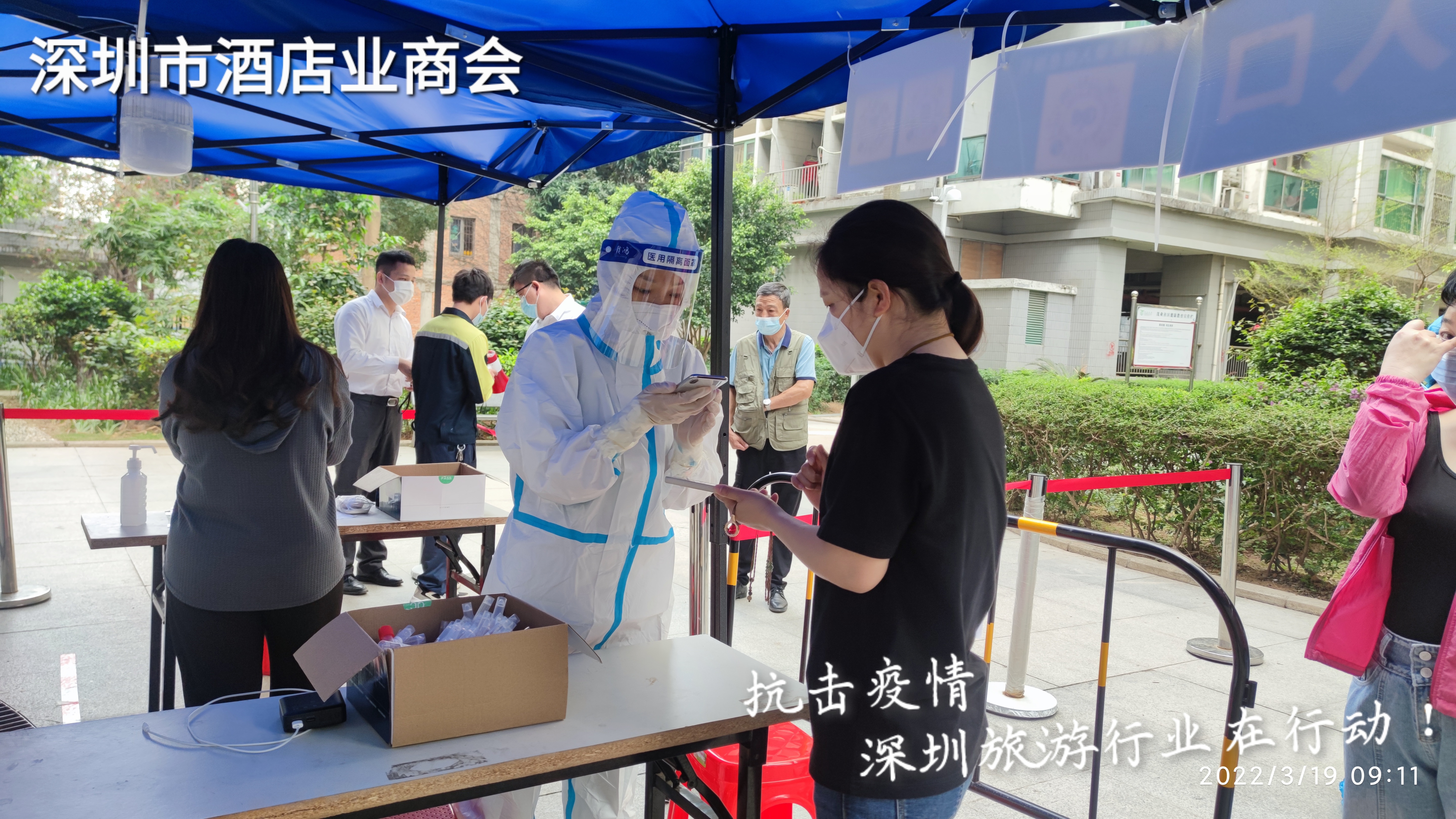 “請大家有序排隊,提前準備好核酸碼!”“您好,請有序排隊做核酸檢測!”“請大家登記好後記得截圖保存!”在檢測點入口,來自旅遊行業的志願者們積極維持現場秩序,提醒大家全程佩戴口罩,保持一米距離,幫助醫務人員做好資訊採集工作,保證核酸檢測快速、有序地進行,讓聯防聯控、群防群控落實到位 。深圳各旅遊企業全力投入,迅速瞭解抗疫短缺物資,向抗疫前線捐贈包括N95口罩、消毒液、洗手液、消毒濕巾等抗疫物資。