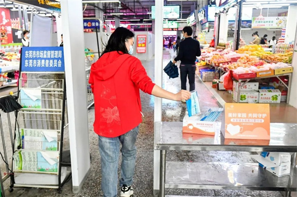 在長安鎮增田市場大門入口處,也設有免費領取口罩點,印有「『美好家園 共同守護』長安鎮全民戴口罩行動」等標識的宣傳牌及口罩盒擺放在醒目位置,一個個獨立包裝的醫用外科口罩放在口罩盒裏,免費讓過往有需要的群眾領取。